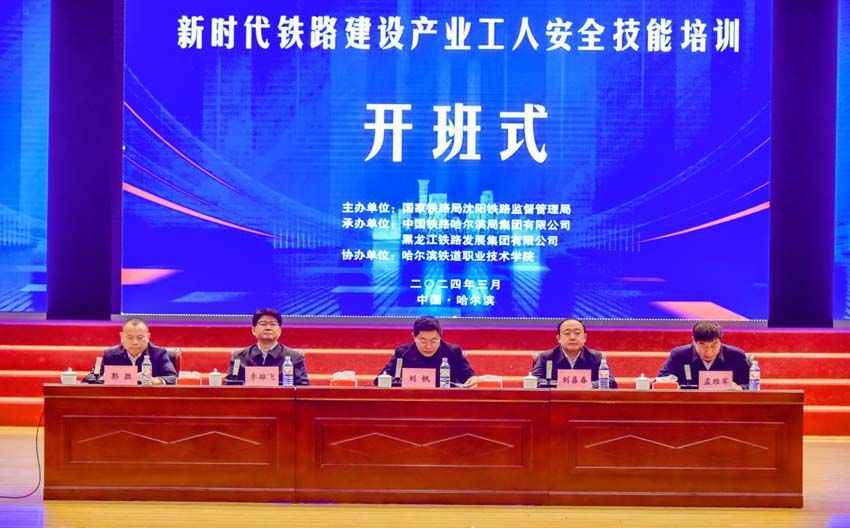 3月29日,由国家铁路局沈阳铁路监督管理局主办,中国铁路哈尔滨局集团有限公司和黑龙江铁路发展集团有限公司承办,哈尔滨铁道职业技术学院协办的新时代铁路建设产业工人安全技能培训班在哈铁学院大学生活动中心开班。来自新建铁伊铁路、哈铁铁路各施工单位的一线工人共计895人参加培训。国家铁路局沈阳监督管理局监管局局长刘帆、中国铁路哈尔滨局集团有限公司副总经理刘喜春出席开班式并讲话,施工单位中铁二局集团有限公司副总经理郭胜作表态发言,学院党委副书记、院长孟维军致欢迎词。黑龙江铁路发展集团有限公司党委书记、总经理李雄飞主持开班式。