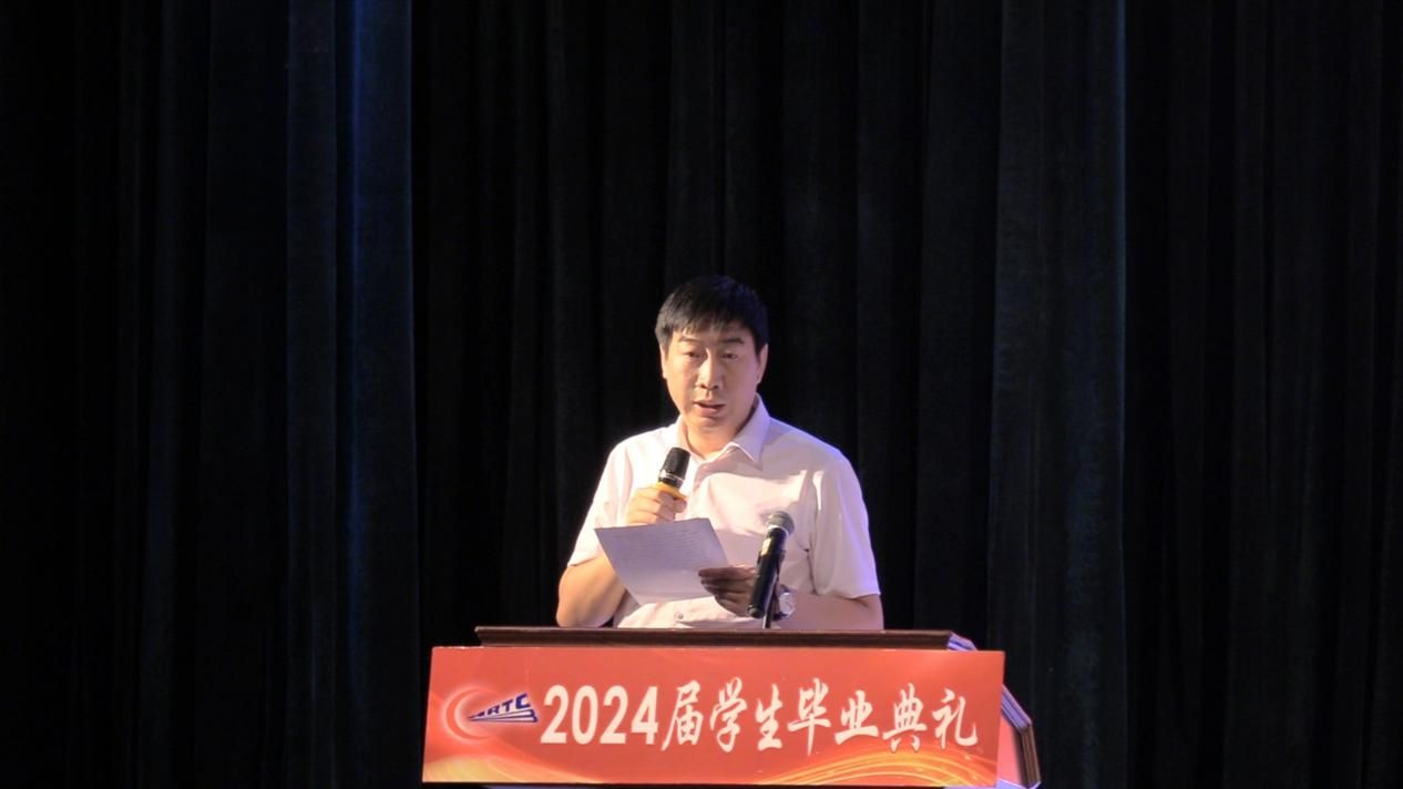 学院副院长马绍南宣读《哈尔滨铁道职业技术学院关于表彰2024年黑龙江省“优秀毕业生”的决定》,学院领导班子为优秀毕业生代表颁发荣誉证书并授予毕业证书。