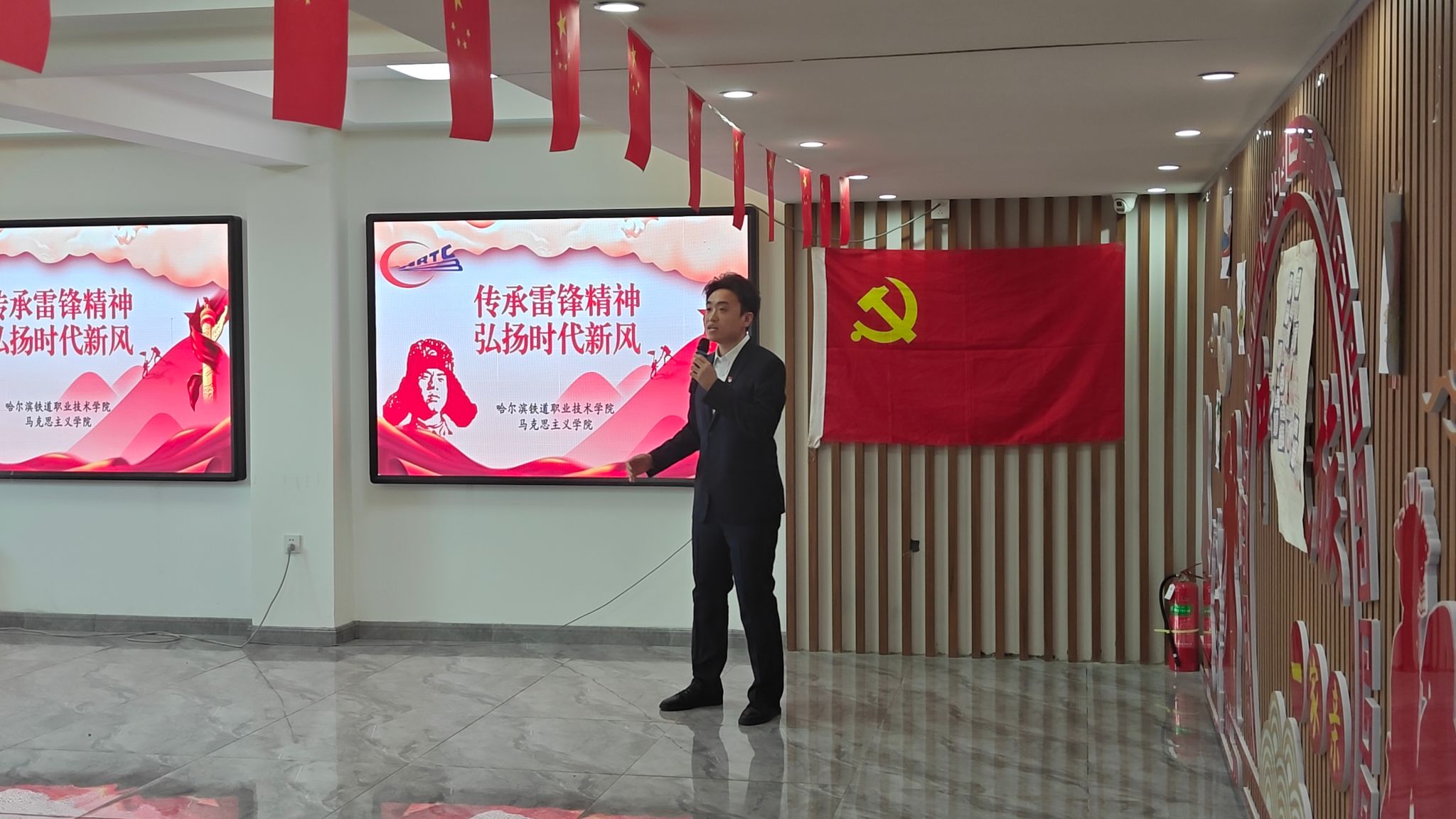 3月16日,在学院团委的指导下,铁道建筑学院携手马克思主义学院走进碧桂园社区,举办“传承雷锋精神,争做时代新人”主题文艺展演。师生与居民联袂献艺,通过演讲、歌舞、相声等多元形式,深情致敬榜样、唱响青春强音、共绘校社同心图景。随后开展的雷锋知识问答,居民踊跃参与,在趣味互动中重温事迹、感悟精神。马克思主义学院教师刘烜廷现场解读雷锋精神的当代价值,为学子与居民带来深刻的精神洗礼,指引大家将雷锋精神融入日常、化为经常。整场活动实现了校社共建与精神传承的“双向奔赴”。