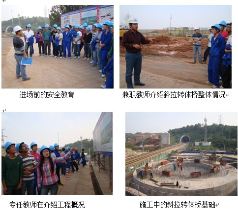 该桥综合了目前斜拉桥建造中所运用的多项技术,结构新颖,技术难点多,施工工艺复杂,是国内第一座高速铁路跨越运营中的高速铁路大跨斜拉转体桥梁,为铁道部的重点科研项目。基础采用12φ2.2钢筋混凝土钻孔桩,深度达56m,承台为圆形,直径21m。技术人员向学生讲解了桩基施工、承台施作及临近既有线施工的注意事项。学生们亲身体会到高铁斜拉转体桥梁基础施工的高要求,掌握了在既有线、高压电缆等环境下的施工要点。