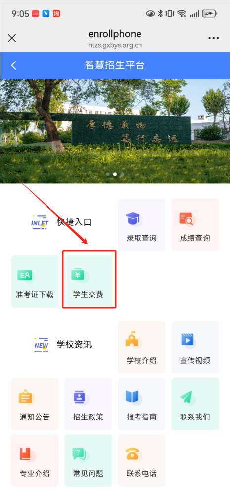 第二步:点击子菜单“学院信息”→“招生智慧平台”→“学生交费”,完成交费。