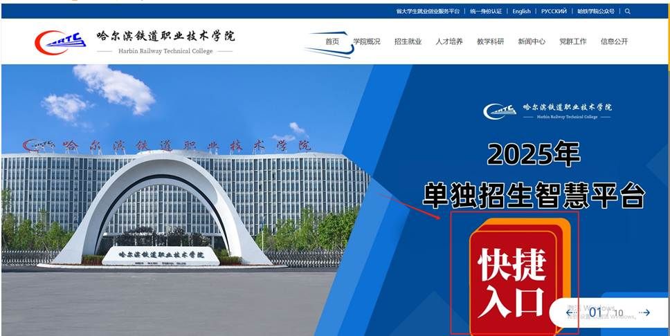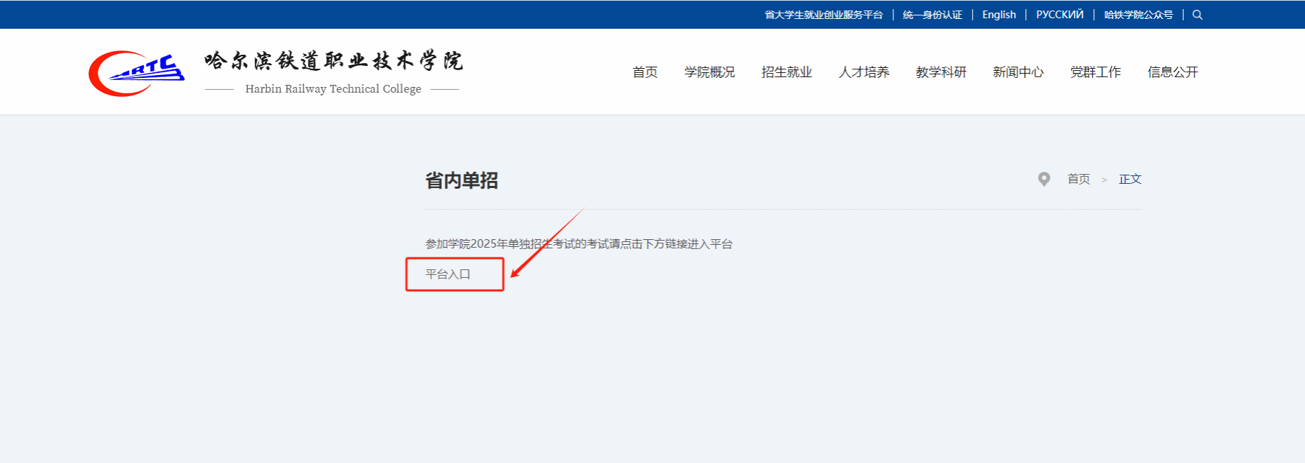 第一步:考生使用电脑登录“哈尔滨铁道职业技术学院”官网,点击首页置顶“2025年单招招生智慧平台快捷入口”进入跳转界面。